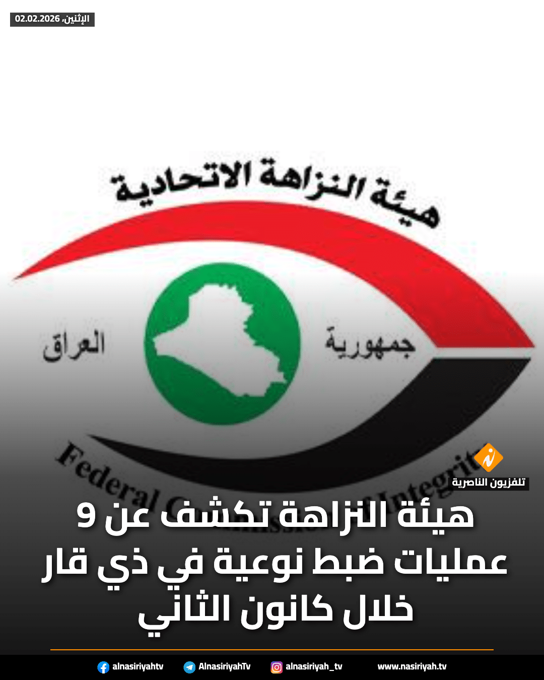 شبكة اخبار الناصرية:أعلنت هيئة النزاهة الاتحادية عن تنفيذ تسع عمليات ضبط نوعية في محافظة ذي قار خلال شهر كانون الثاني…