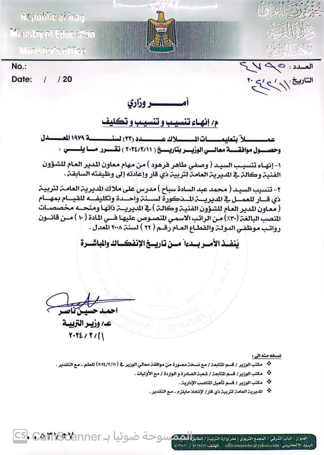 اصدر وزير التربية امرا بتكليف معاون جديد لتربية ذي قار خلفا للمعاون السابق وصفي طاهر فرهود.