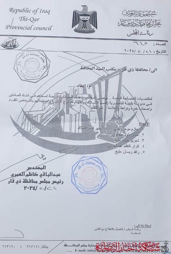 تنشر شبكة اخبار الناصرية قرار مجلس محافظة ذي قار الخاص بالتغييرات في بلدية الناصرية.