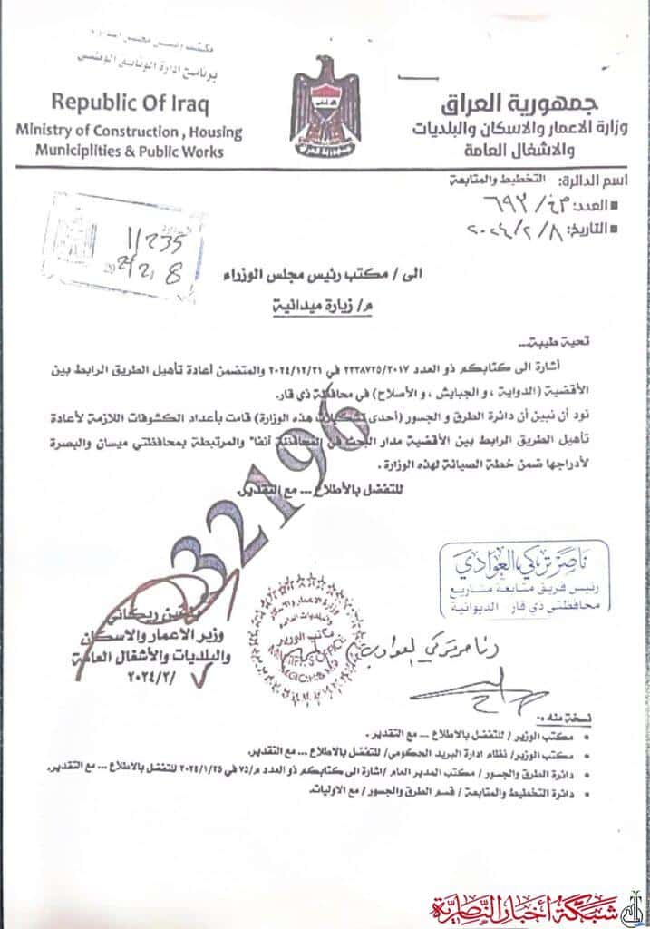 اعلن مستشار رئيس الوزراء ناصر تركي العوادي استحصال موافقة رئيس الوزراء السيد السوداني لأعادة تأهيل الطريق الرابط بين الدواية و الجبايش و الاصلاح في محافظة ذي قار.