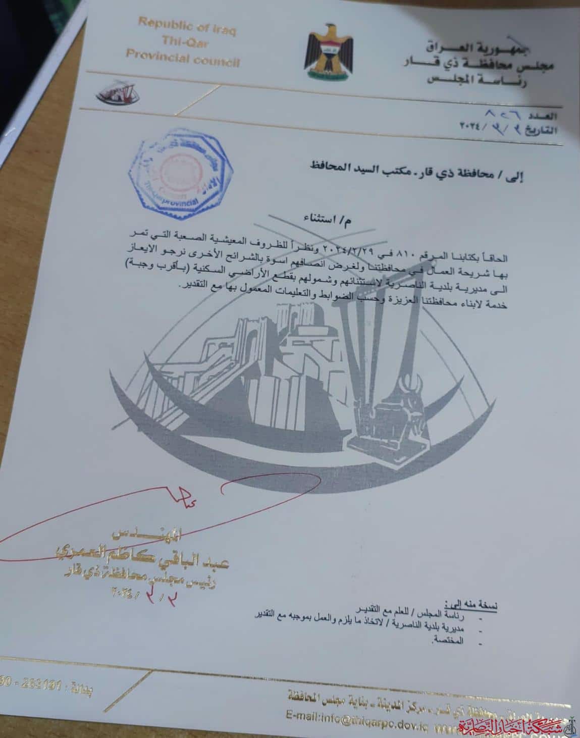 ووجه العمري بلدية محافظة ذي قار بإستثناء وشمول شريحة العمال في المحافظة بقطع اراضي سكنية بأقرب وجبة وحسب الضوابط والتعليمات المعمول بها.