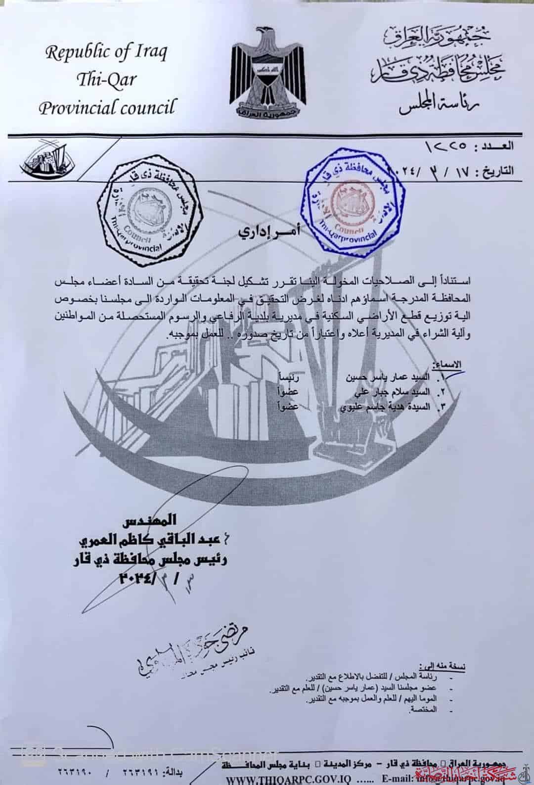 وجهت رئاسة مجلس محافظة ذي قار بتشكيل لجنة من ثلاثة اعضاء للتحقيق في الية توزيع قطع الاراضي بقضاء الرفاعي.