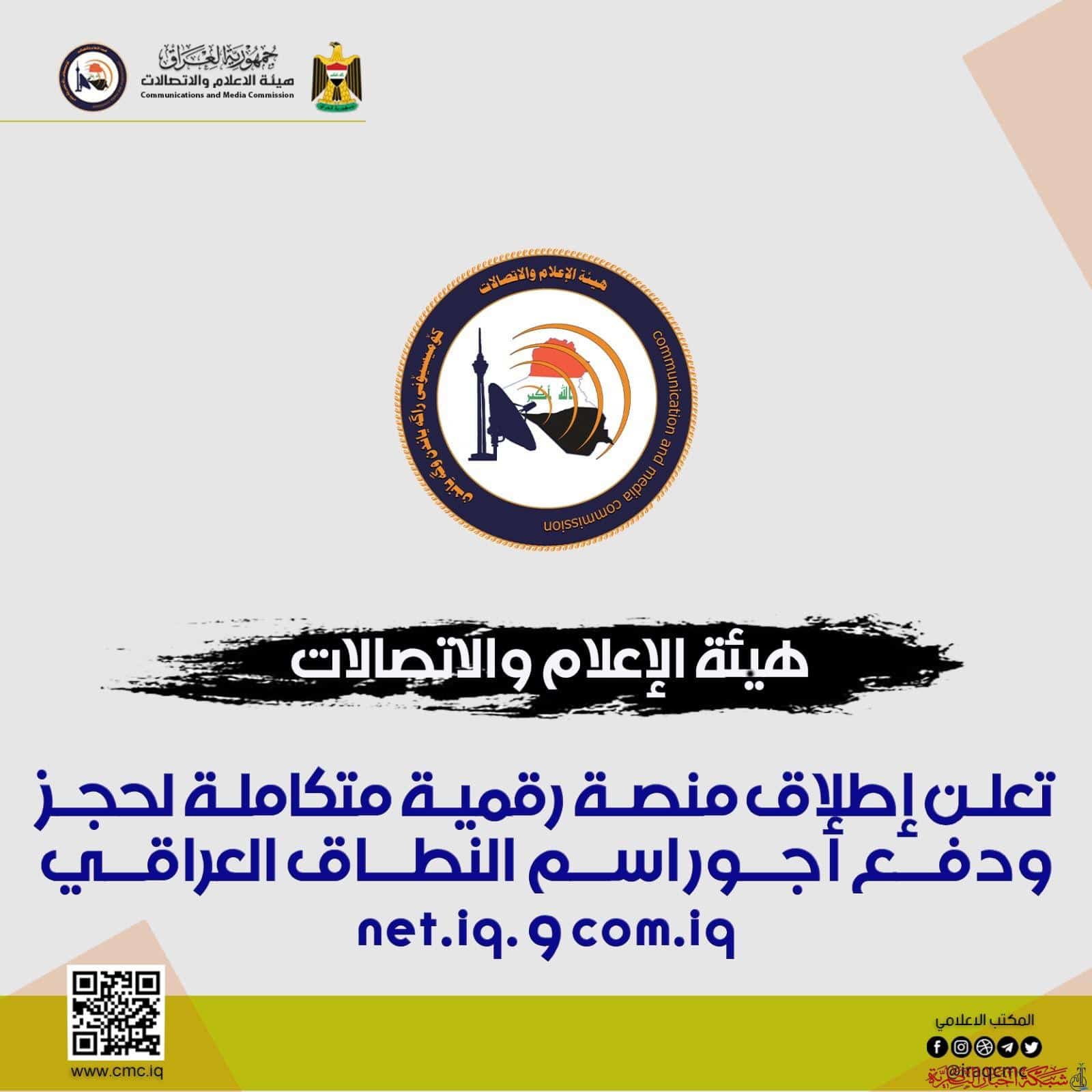 تعلن هيئة الإعلام والاتصالات عن إطلاق المنصة الخاصة بالحجز والدفع الإلكتروني لنطاق العراق الدولي com.iq و .net.iq من قبل الشركات في خطوة لتعزيز استخدام وانتشار هذا الاسم.