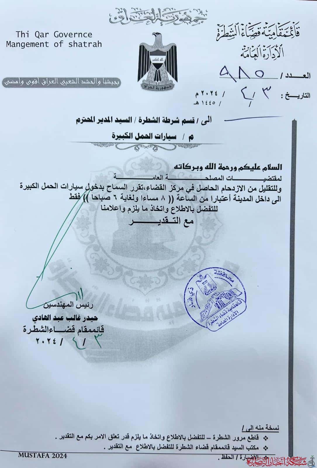 وجه قائممقام قضاء الشطرة شرطة القضاء بمنع دخول الشاحنات الى داخل المدينة الا في اوقات محددة.