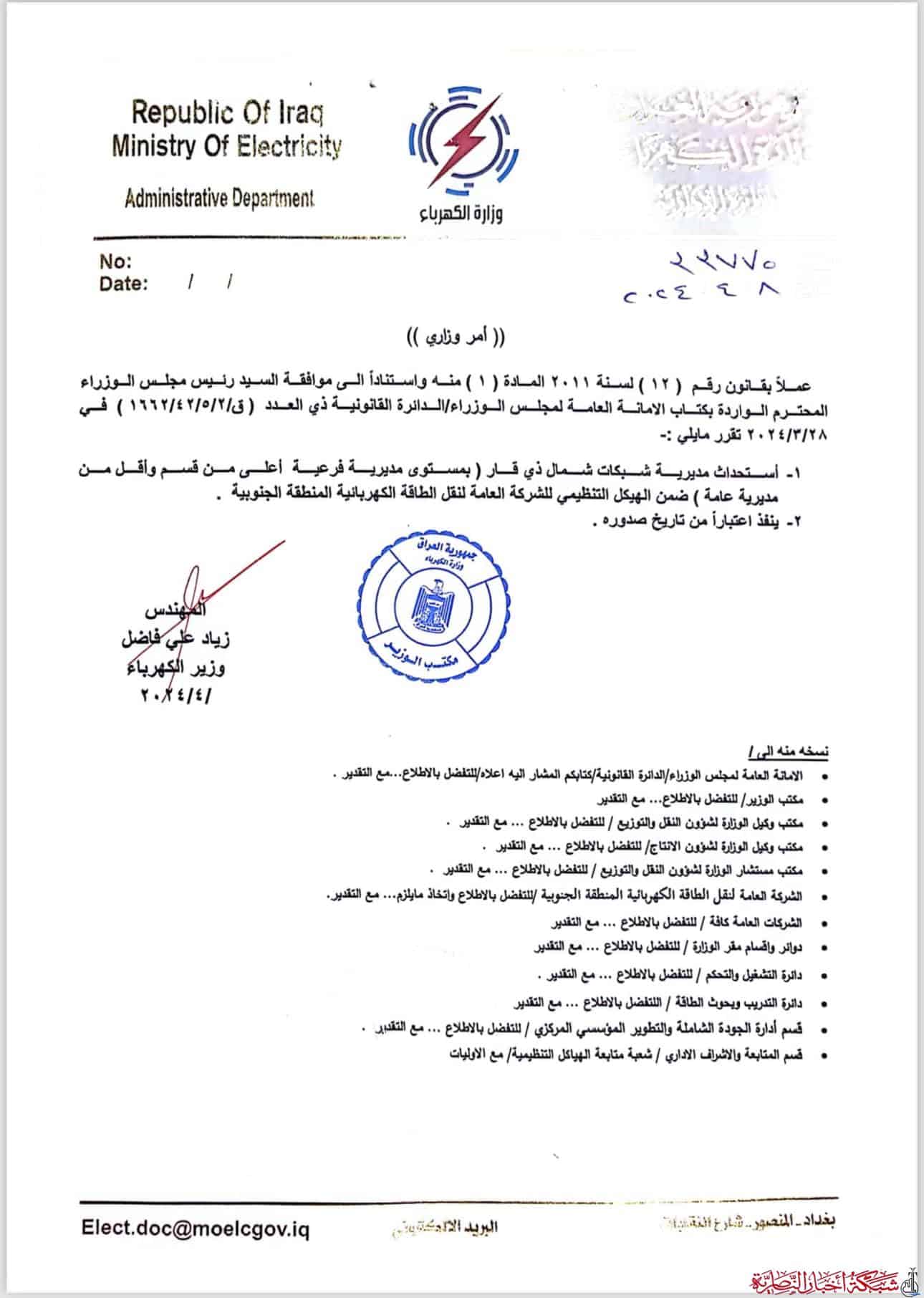 واشار ان استحداثها يكون بمستوى مديرية فرعية ضمن الهيكل التنظيمي للشركة العامة لنقل الطاقة في المنطقة الجنوبية.