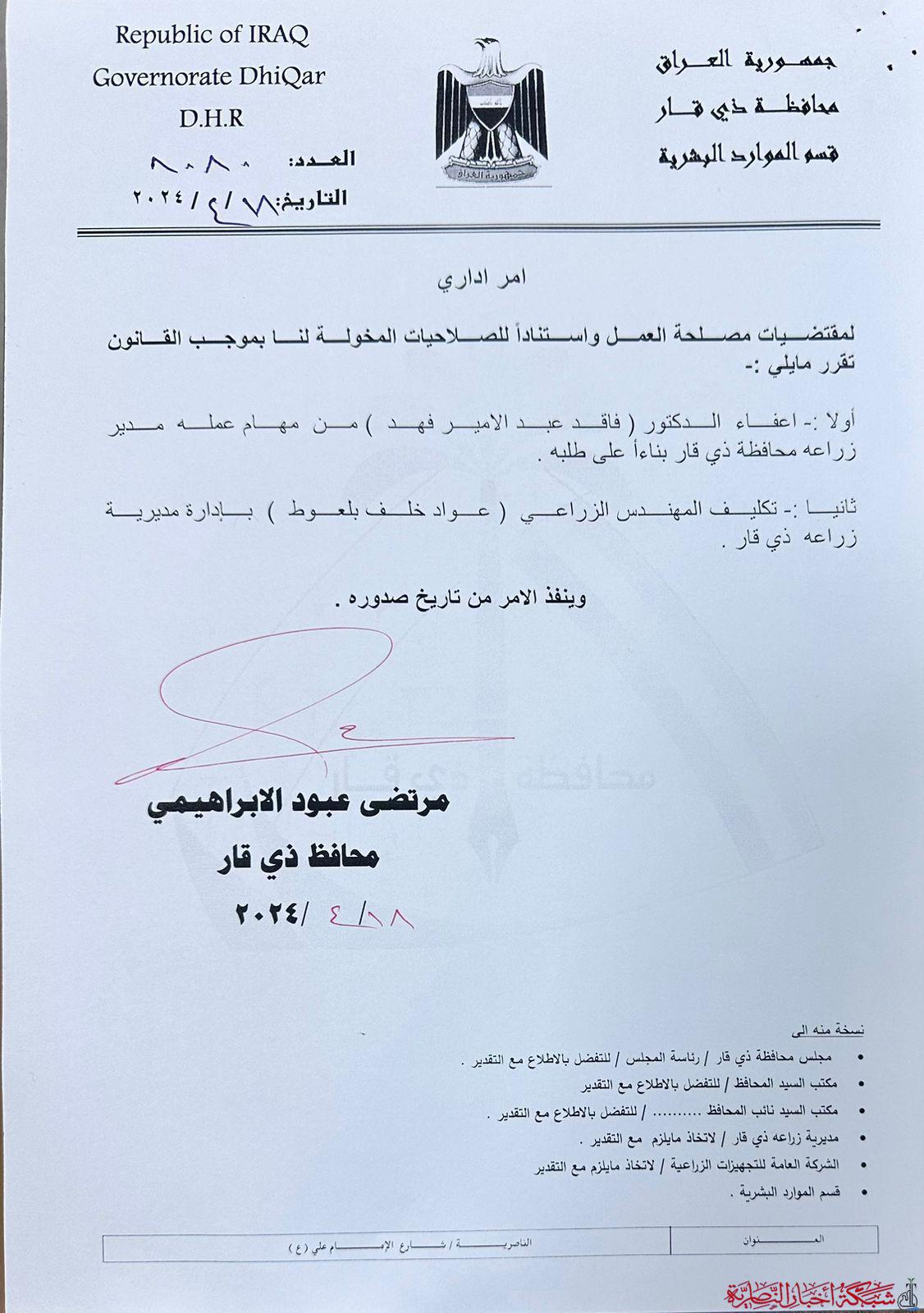 وذكرت الوثيقة تابعته شبكة اخبار الناصرية ان عبد الامير تقدم بطلب اعفاءه من منصه في وقت سابق وتم تكليف بلعوط اثر ذلك.