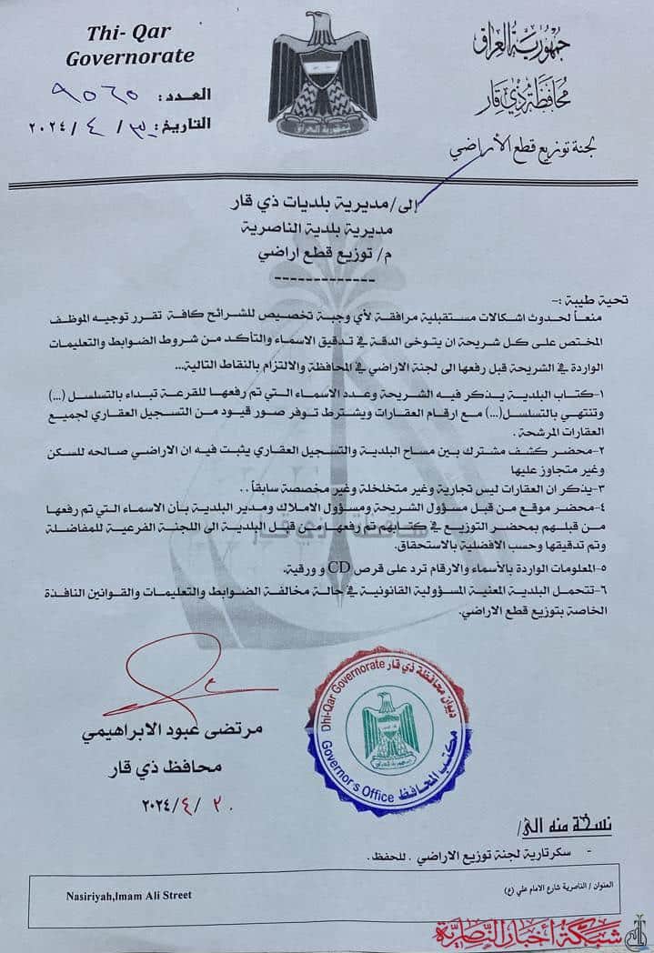 أعلن محافظ ذي قار مرتضى عبود الابراهيمي، اليوم الأربعاء، عن ضوابط جديدة لتوزيع قطع الأراضي في المحافظة.