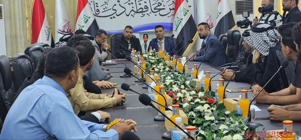 بحث رئيس مجلس محافظة ذي قار عبد الباقي العمري، خلال لقائه النائب حسين البطاط ووفد من أهالي ووجهاء قضاء سوق الشيوخ، مطالب متظاهري سوق الشيوخ.