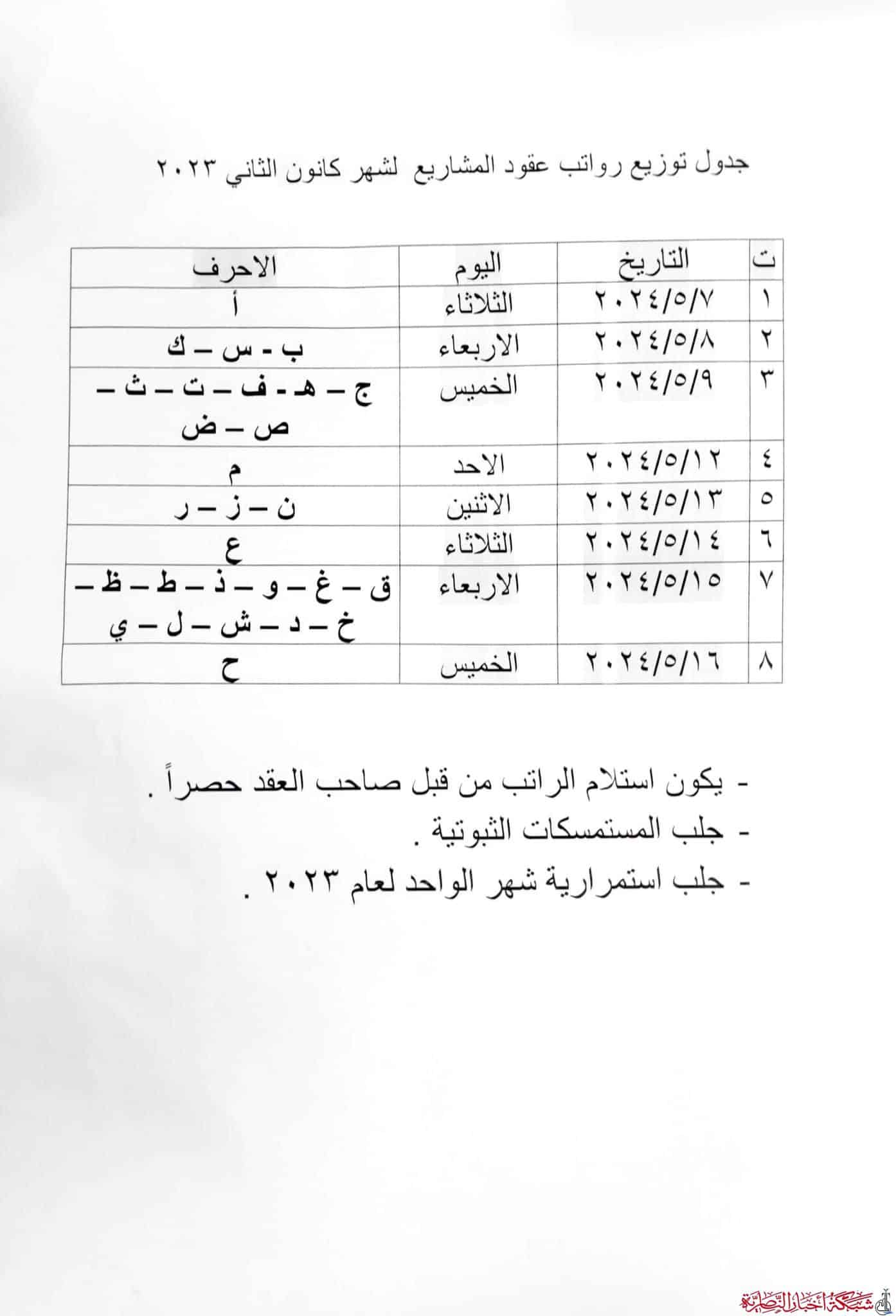 الوثيقة ادناه جدول توزيع رواتب عقود المشاريع لشهر كانون الثاني 2023 حسب التسلسل والضوابط.