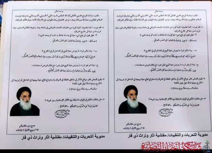 باشرت مفتشية اثار ذي قار، اليوم الاثنين، بطبع وتوزيع فتوى المرجع الديني الأعلى السيد علي السيستاني حول حرمة سرقة الآثار.