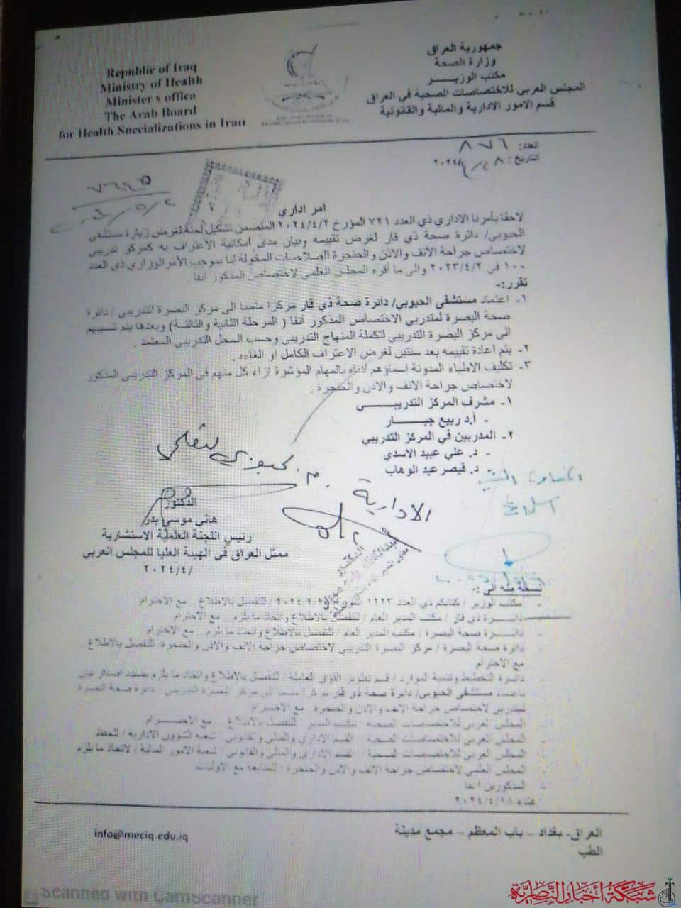 وبحسب وثيقة رسمية اطلعت عليها شبكة أخبار الناصرية أنه “تم تشكيل لجنة وزارية لزيارة المستشفى لغرض تقييمه وبيان مدى إمكانية الاعتراف به كمركز تدريبي لاختصاص جراحة الأنف والاذن والحنجرة”.