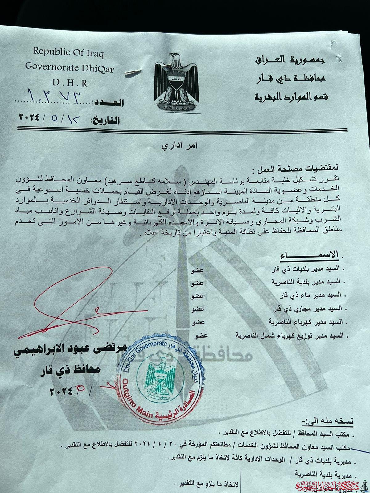 وقال السرهيد في حديث لـ”شبكة اخبار الناصرية”، ان الابراهيمي وجه “بتشكيل خلية متابعة برئاسته وعضوية ستة مدراء لدوائر خدمية للقيام بحملات خدمية أسبوعية”.
