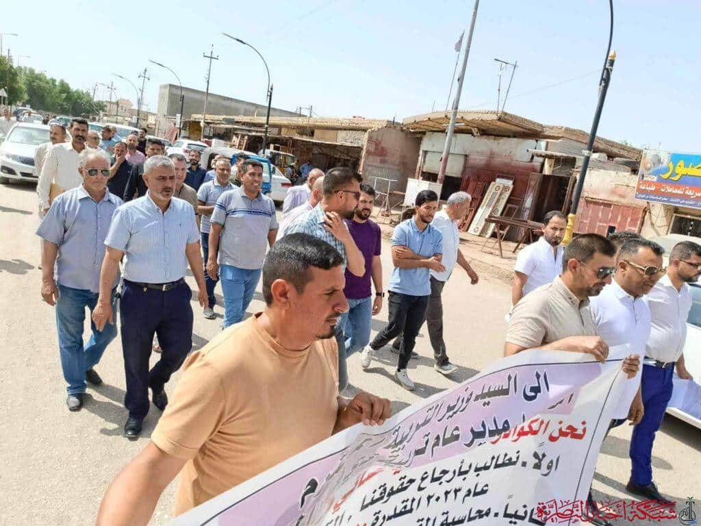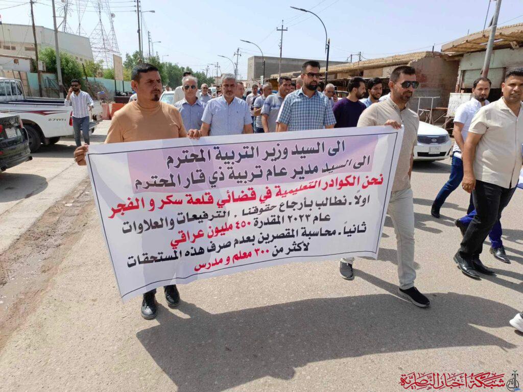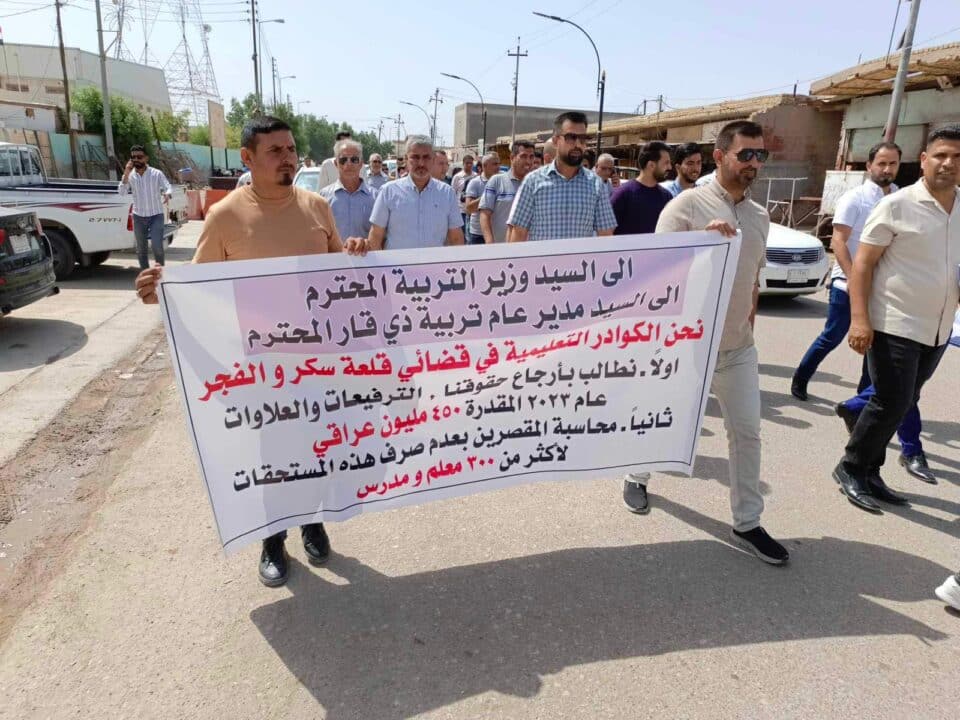 تظاهر العشرات من التربويين، اليوم الاثنين، في قضاء قلعة سكر شمل مدينة الناصرية، للمطالبة بصرف مستحقاتهم المالية للعام 2023 .