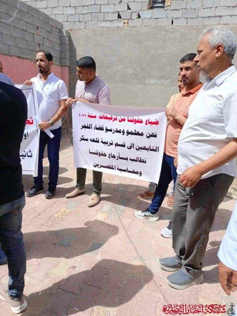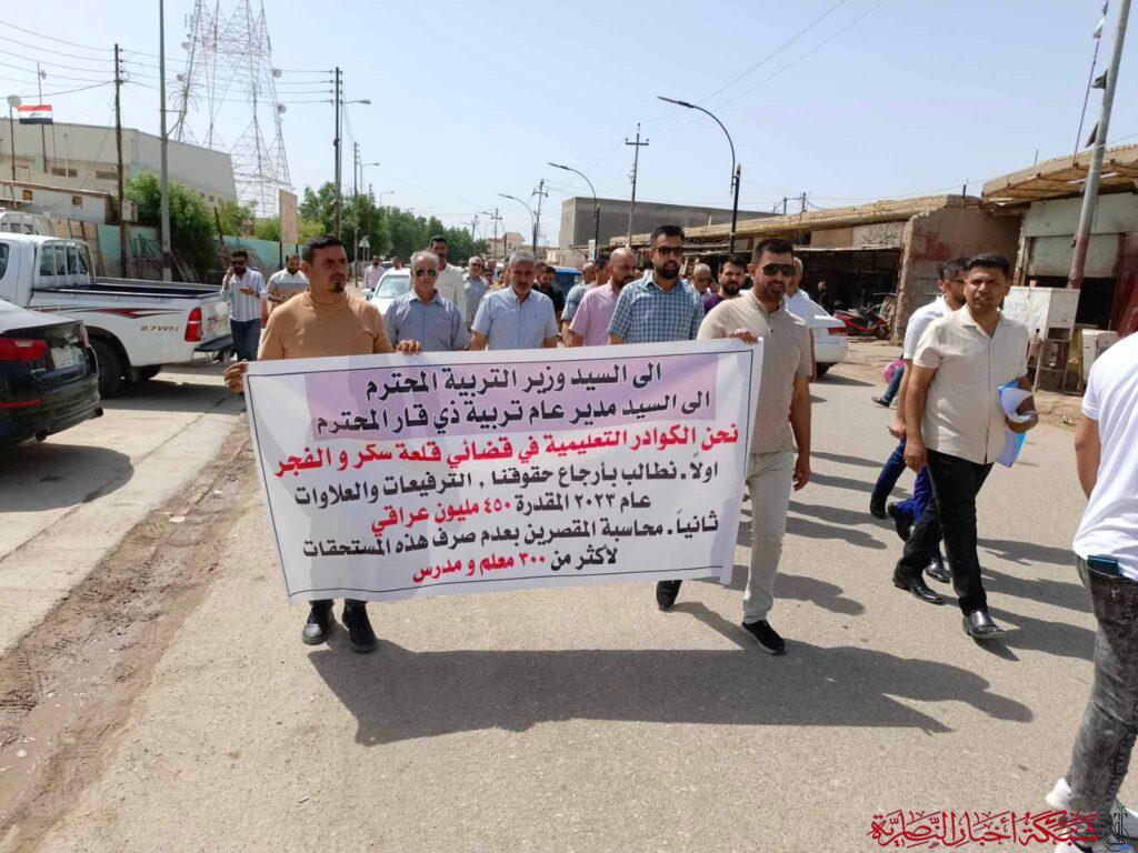 وتجمع المتظاهرون امام مبنى قسم تربية قلعة سكر وهم يحملون لافتات كتب عليها ( نحن كوادر التعليمية نطالب بارجاع حقوقنا الترفيعات والعلاوات عام 2023 ، ومحاسبة المقصرين بعدم صرف هذه المستحقات لأكثر من 300 معلم ومدرس .