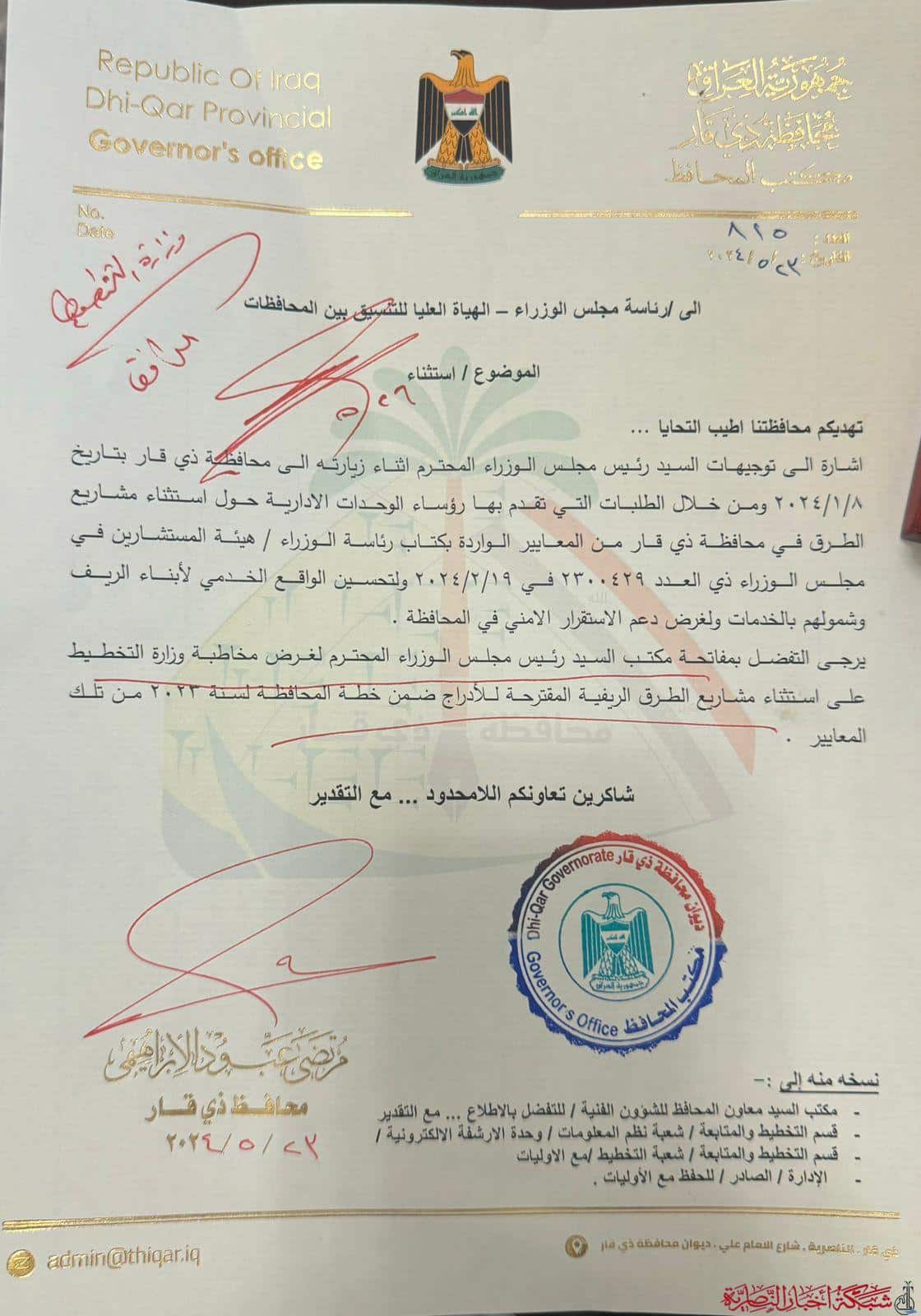 محافظ ذي قار يستحصل موافقة السوداني على استثناء مشاريع الطرق الريفية من تعليمات وزارة التخطيط