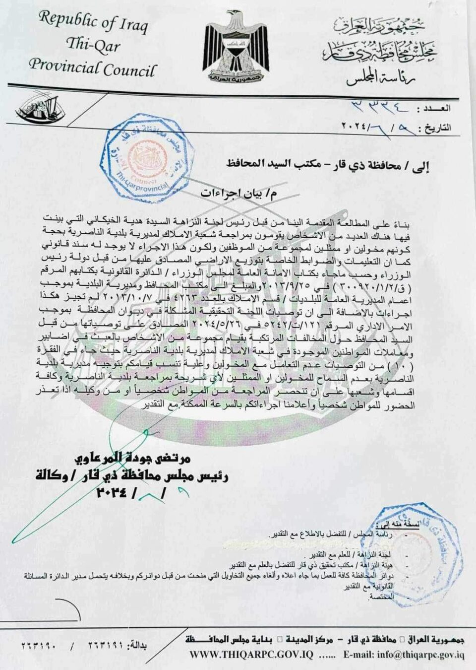 وأوضحت اللجنة في وثيقة رسمية اطلعت عليها شبكة اخبار الناصرية أن التعليمات والضوابط الخاصة بتوزيع الأراضي لا تجيز مثل هذه الإجراءات، مشيرة إلى أن توصيات لجنة تحقيقية سابقة شكلها ديوان المحافظة قد دعت إلى عدم التعامل مع المخولين.