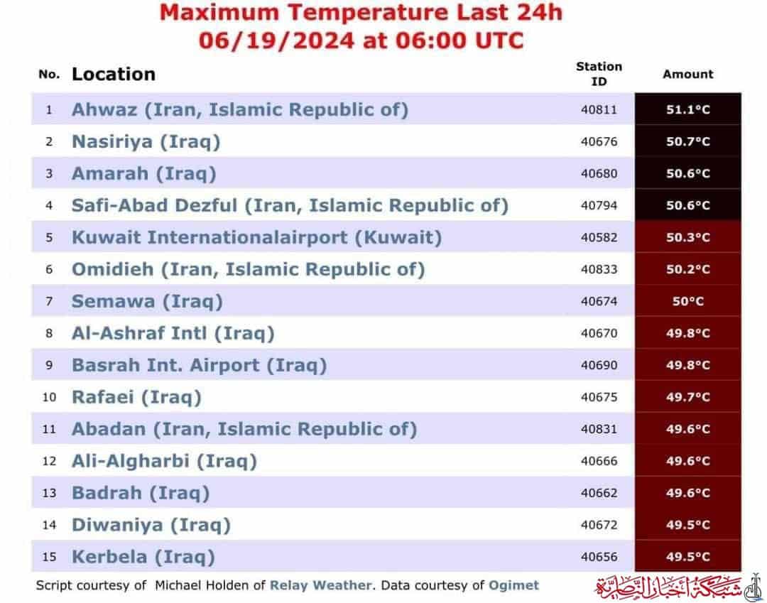 شهدت مدينة الناصرية العراقية اليوم ارتفاعًا قياسيًا في درجات الحرارة، حيث سجلت 50.7 درجة مئوية، لتتصدر بذلك قائمة المحافظات العراقية الأكثر حرارة.