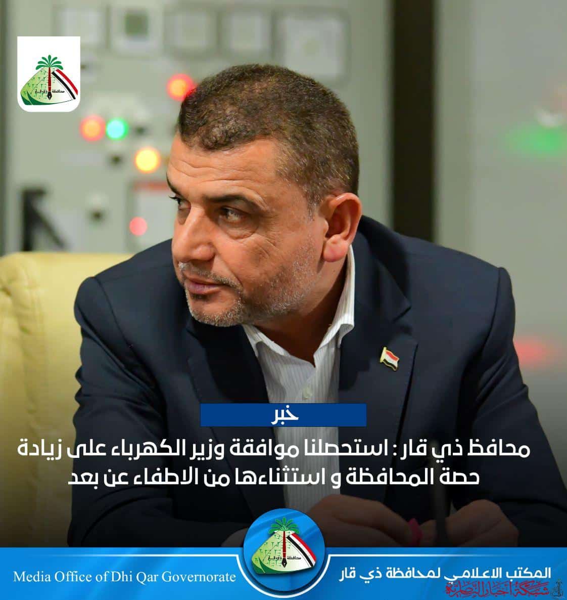 أعلن محافظ ذي قار، مرتضى عبود الابراهيمي، عن استحصال موافقة وزير الكهرباء على استثناء المحافظة من “عن بعد” ، وزيادة تجهيزها بالطاقة الكهربائية، ورصد مبالغ للصيانة وتوفير المواد الأساسية اللازمة.