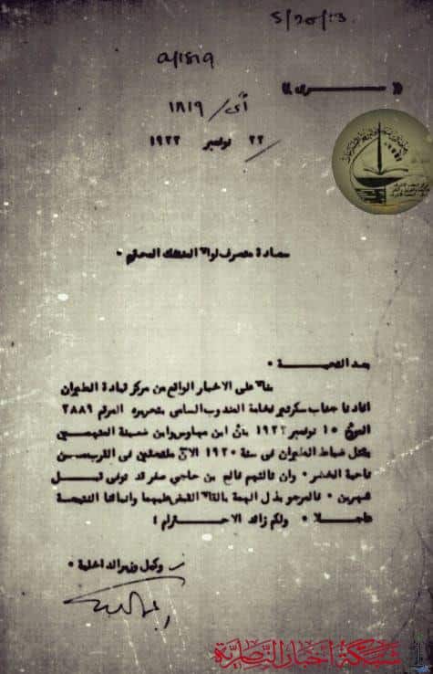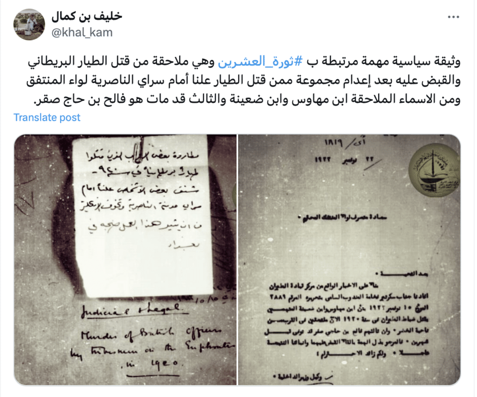 تداول مدونون على موقع التواصل الاجتماعي تويتر وثيقة تاريخية مهمة مرتبطة بثورة العشرين في العراق، وتكشف تفاصيل ملاحقة السلطات البريطانية لقتلة طيار بريطاني في مدينة الناصرية، مركز لواء المنتفق آنذاك.