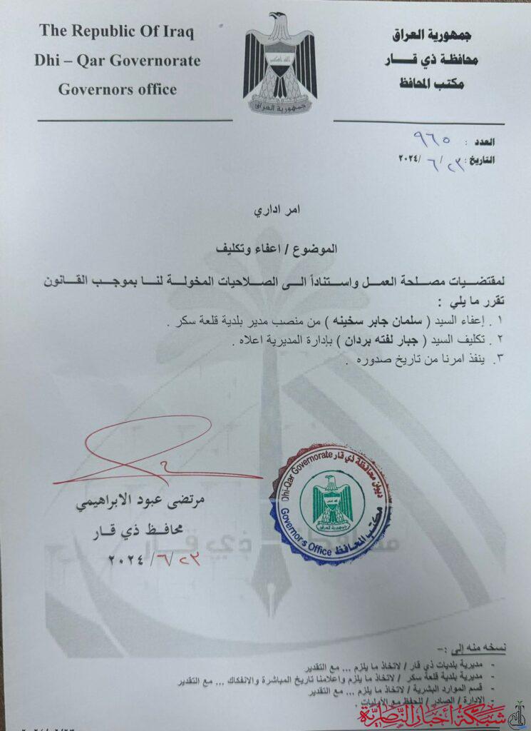 أفاد تلفزيون الناصرية المحلي في خبر عاجل بأن محافظ ذي قار، مرتضى الابراهيمي، أصدر اليوم الأحد أمراً إدارياً بتكليف جبار لفتة بردان مديراً لبلدية قضاء قلعة سكر، خلفاً للمدير السابق سلمان جابر سخينه.