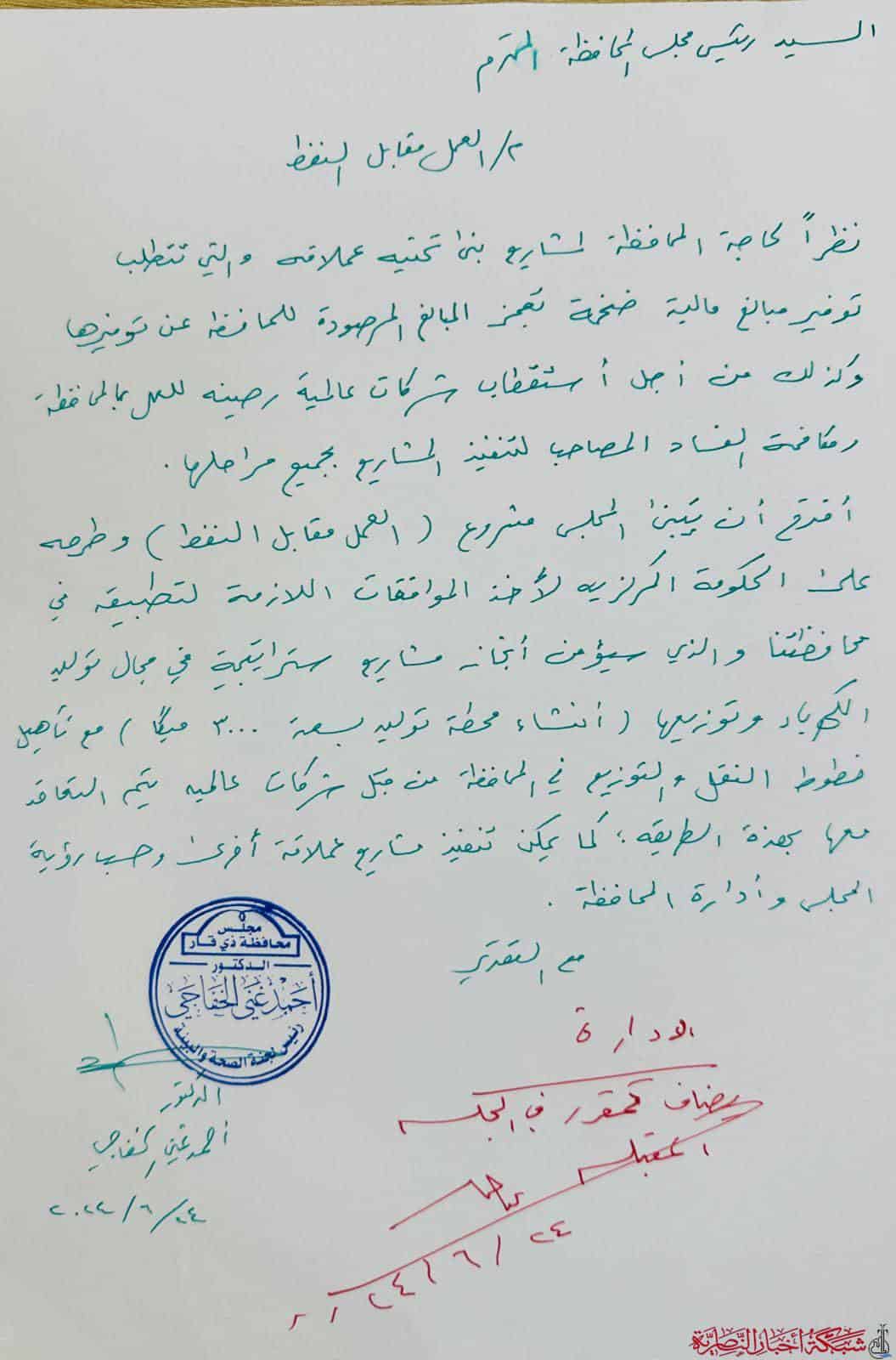 تبحث محافظة ذي قار عن حلول مبتكرة لمواجهة أزمة الكهرباء المتفاقمة، حيث تقدم الدكتور أحمد الخفاجي، عضو مجلس المحافظة، بمقترح جديد تحت عنوان “العمل مقابل النفط”.