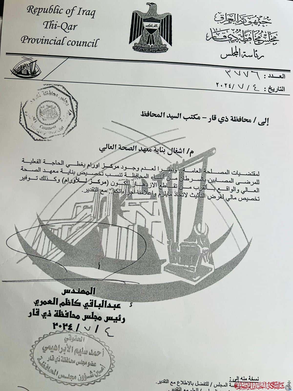 خاطب مجلس محافظة ذي قار، المحافظ بتخصيص معهد الصحة العالي ليكون مركزا متخصصا لعلاج الأورام السرطانية في المحافظة.