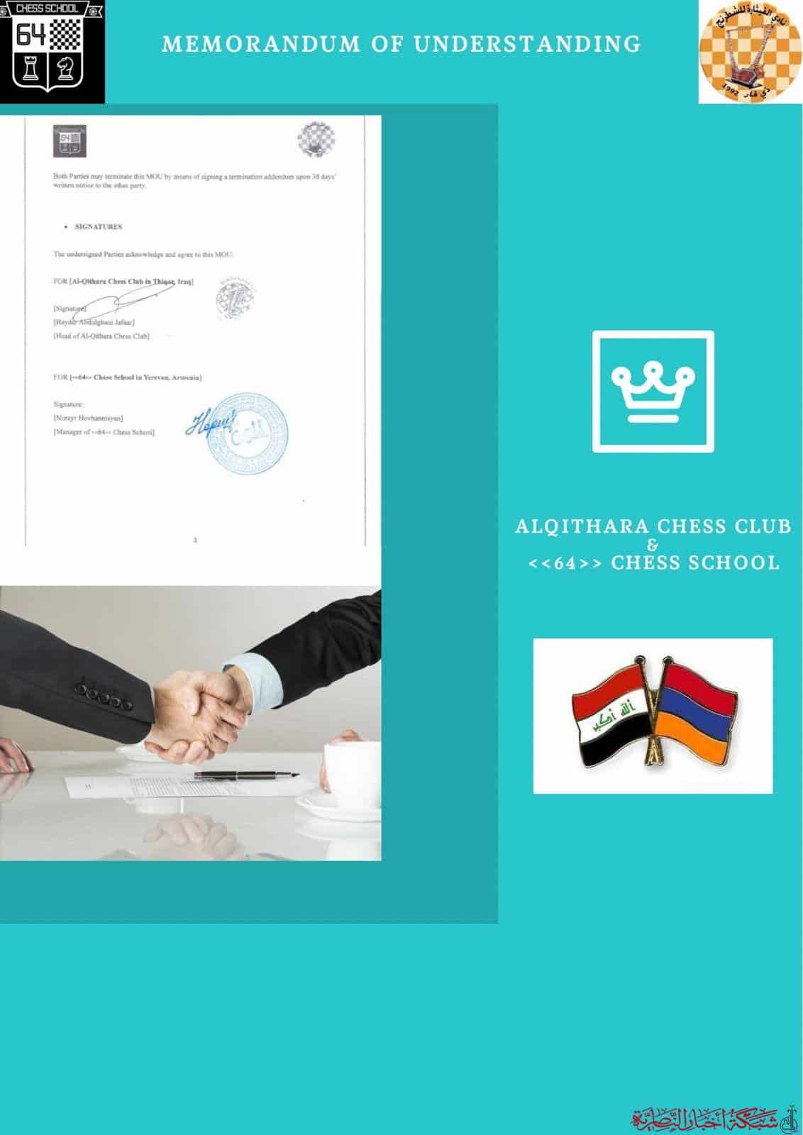 وقع نادي القيثارة التخصصي للشطرنج في ذي قار مذكرة تفاهم مع مدرسة 64Chess الأرمينية، في شراكة ستمتد لثلاث سنوات قابلة للتجديد.