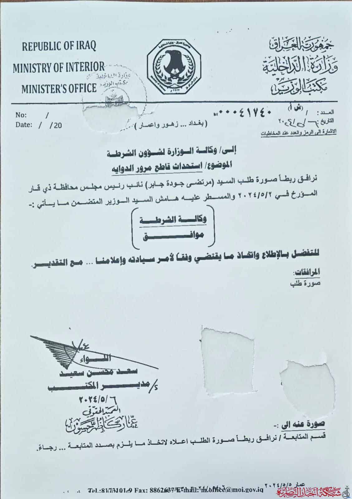 وأوضح السعيدي في وثيقة اطلعت عليها شبكة اخبار الناصرية أن الطلب الذي تقدم به إلى الوزير قد تمت الموافقة عليه، وتمت إحالته إلى وكالة الوزارة لشؤون الشرطة لاتخاذ الإجراءات اللازمة لتنفيذ هذا القرار.