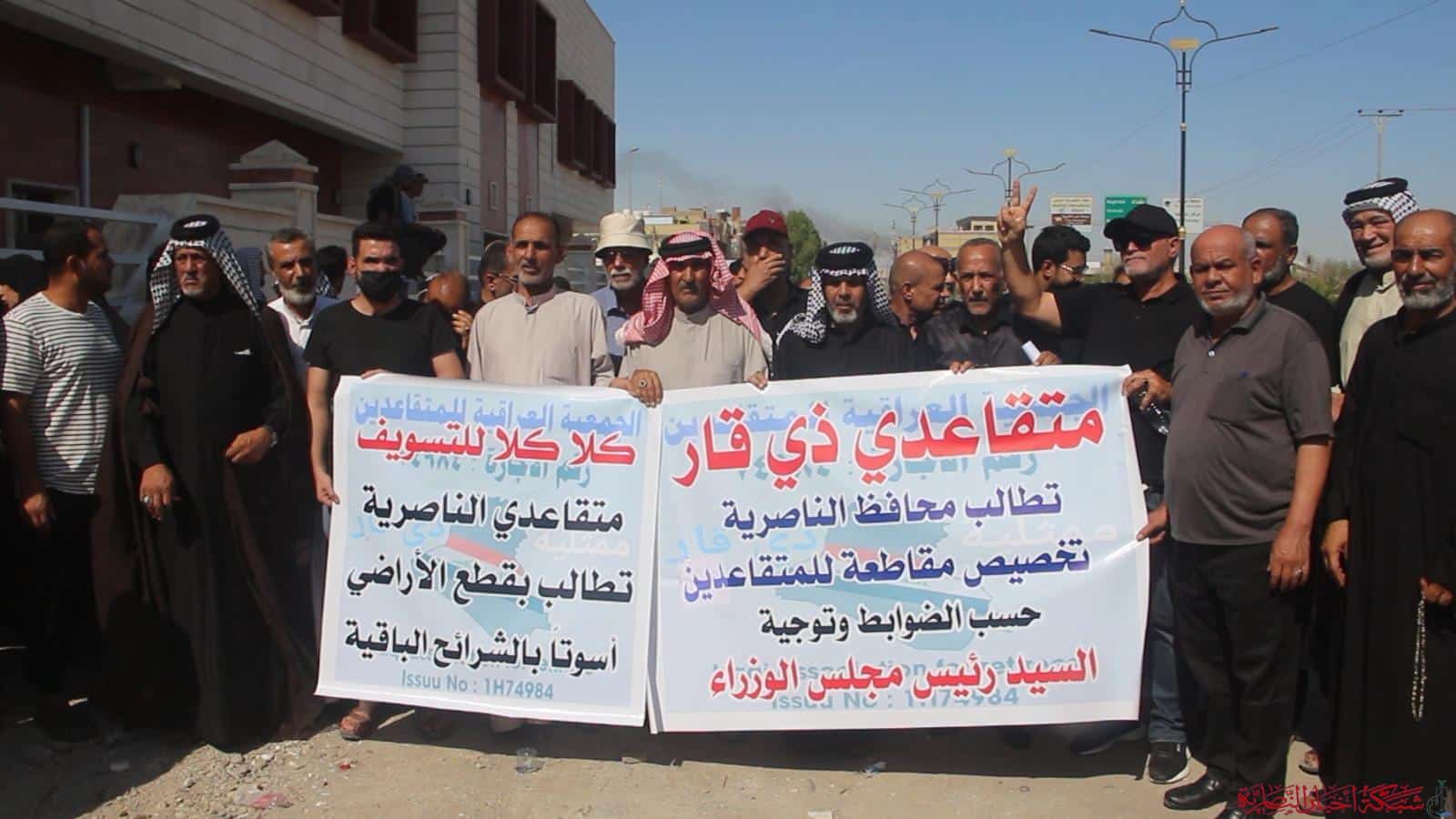 تظاهر العشرات من المتقاعدين أمام مبنى ديوان محافظة ذي قار، مطالبين بتوفير قطع أراضٍ سكنية لهم.