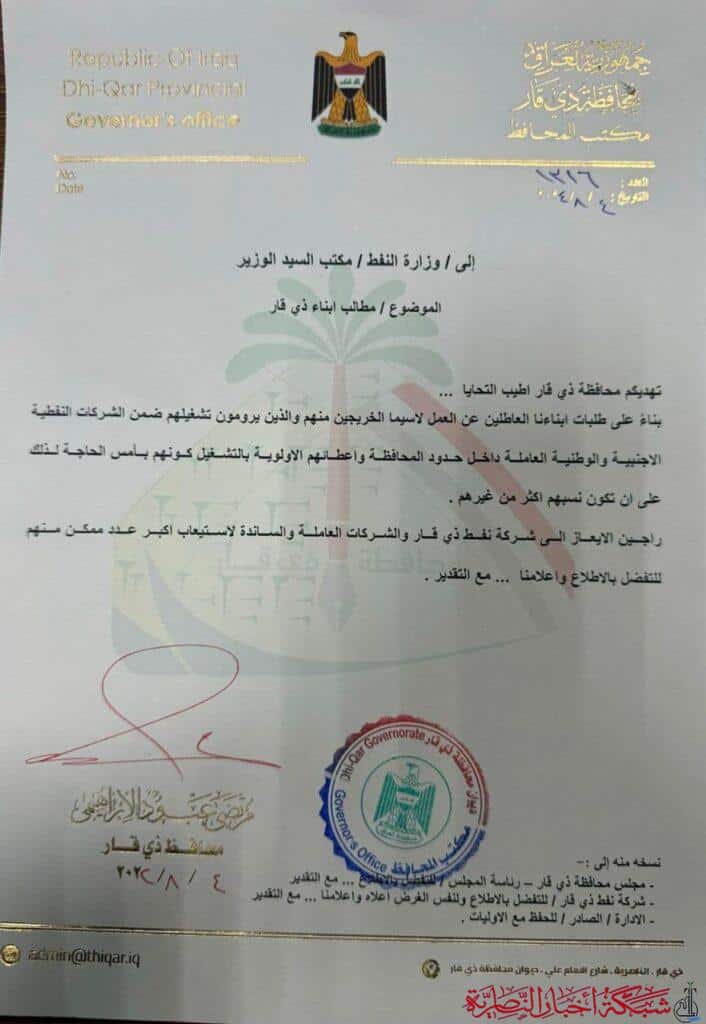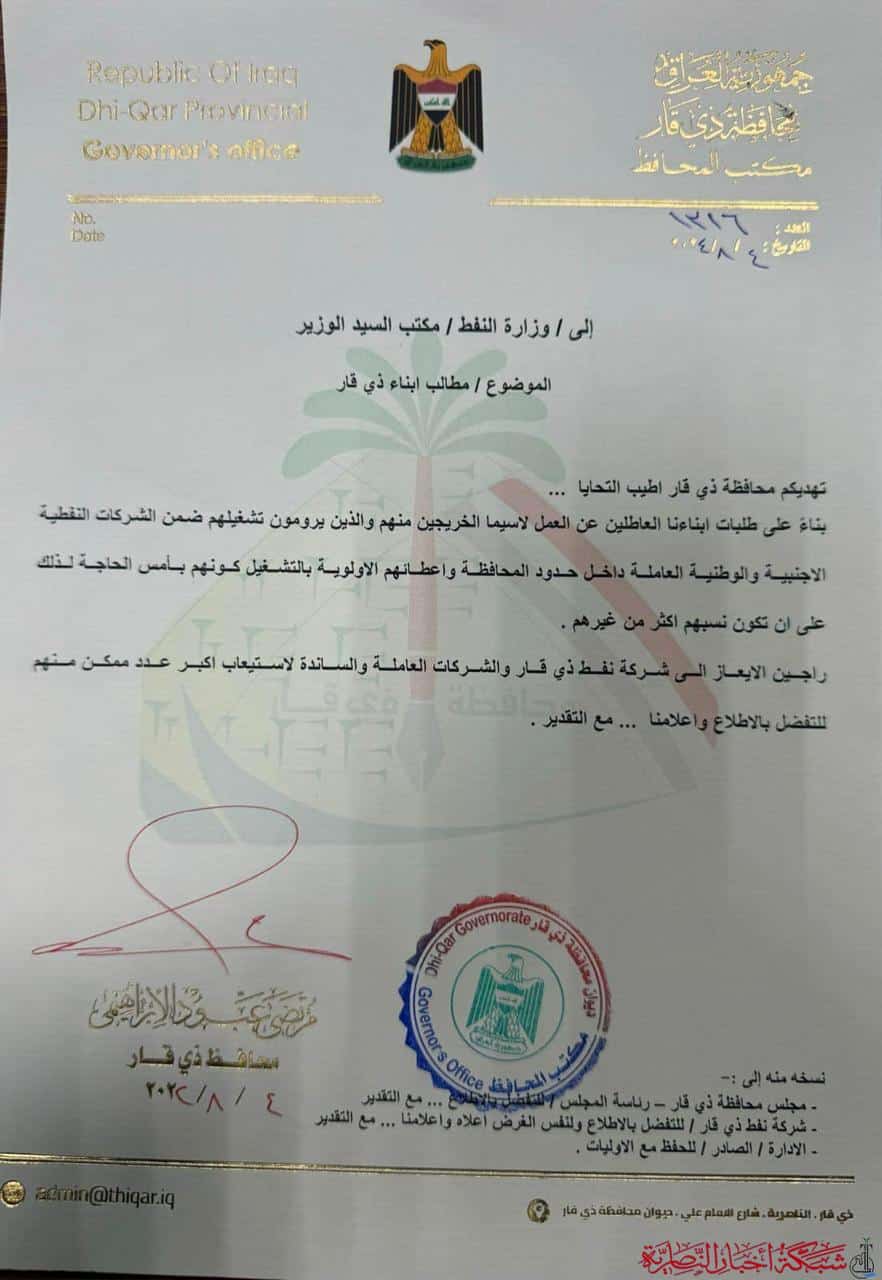 وجهت محافظة ذي قار رسالة إلى وزارة النفط، طالبت فيها بإعطاء الأولوية لتشغيل أبناء المحافظة، خصوصاً الخريجين منهم، في الشركات النفطية العاملة ضمن حدود المحافظة.