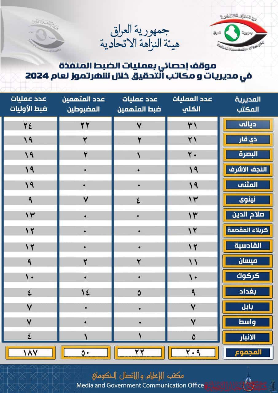 أعلنت هيئة النزاهة الاتحادية، اليوم الاثنين ، عن عمليات الضبط المنفذة من قبل مكاتبها خلال شهر تموز الماضي.