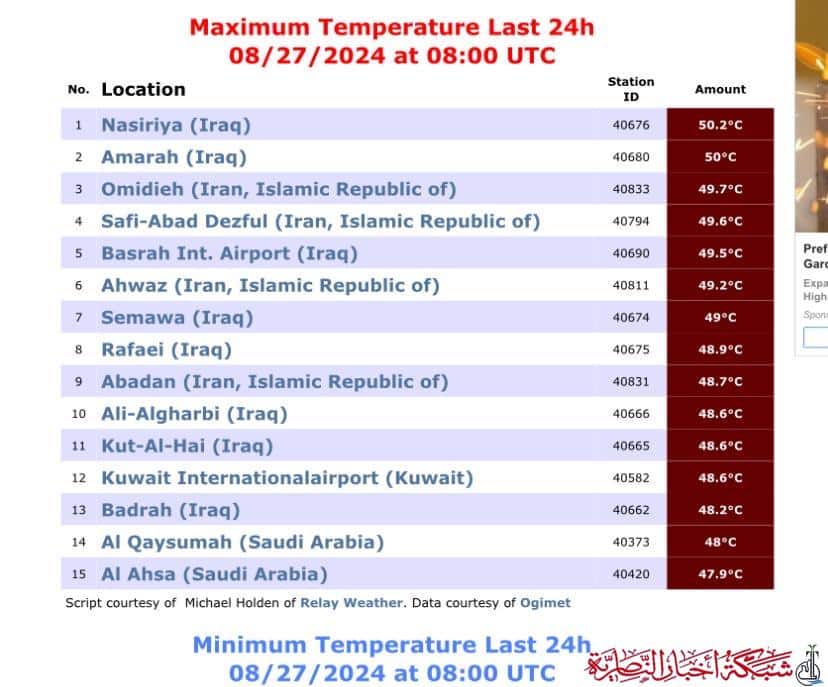 لليوم الثاني على التوالي، تصدرت مدينة الناصرية قائمة أعلى درجات الحرارة المسجلة عالمياً خلال الـ 24 ساعة الماضية، حيث بلغت 50،2 درجة مئوية، وذلك وفقا لمؤشر محطة بلاسيرفيلي الأمريكية.