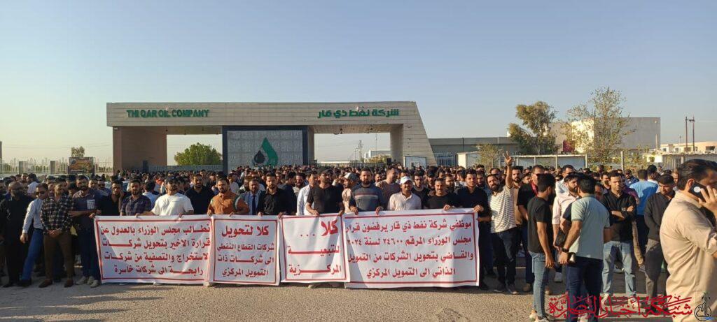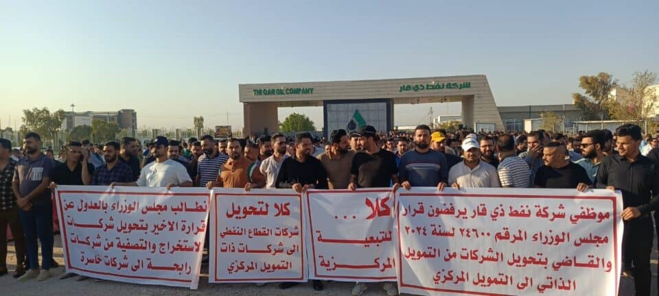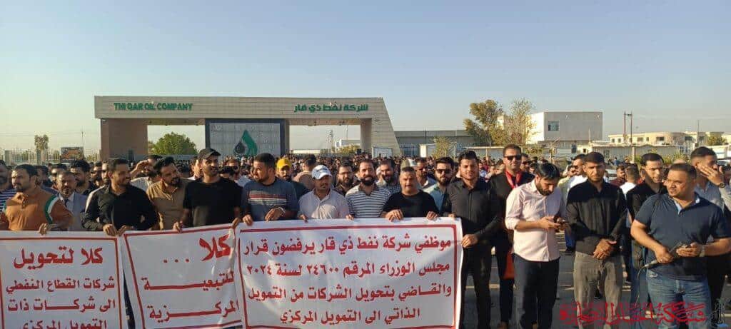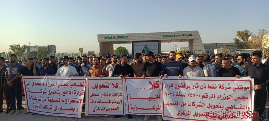ورفع المحتجون لافتات تحمل شعارات مناهضة للقرار، منها “موظفو شركة نفط ذي قار يرفضون قرار مجلس الوزراء رقم 24600 لسنة 2024″، و”كلا لتحويل الشركات النفطية”، مشيرين إلى أن هذا التحول قد يؤدي إلى تحويل الشركات الرابحة إلى شركات خاسرة.