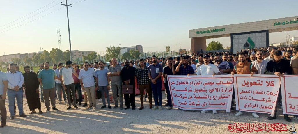 نظم العشرات من موظفي شركة نفط ذي قار اليوم وقفة احتجاجية أمام مقر الشركة، تعبيرًا عن رفضهم لقرار الحكومة المركزية القاضي بتحويل الشركات النفطية من التمويل الذاتي إلى التمويل المركزي.