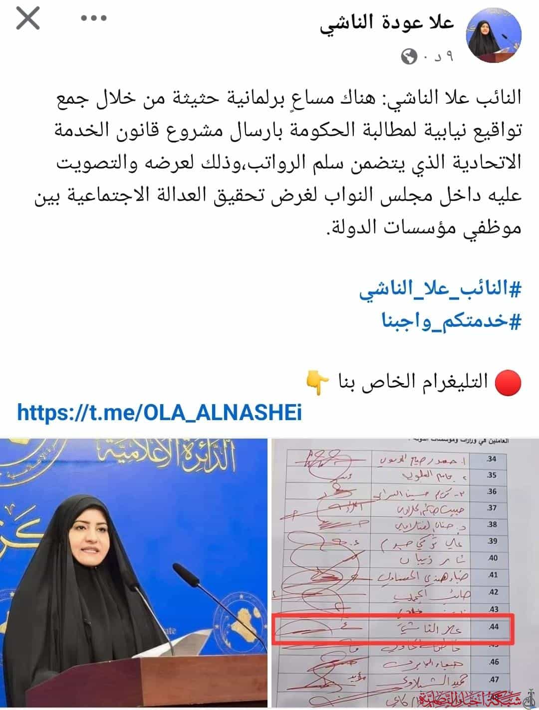 أعلنت النائب علا الناشي عن مساعٍ برلمانية حثيثة لجمع تواقيع نيابية بهدف مطالبة الحكومة بإرسال مشروع قانون الخدمة الاتحادية، الذي يتضمن سلم الرواتب، إلى مجلس النواب.