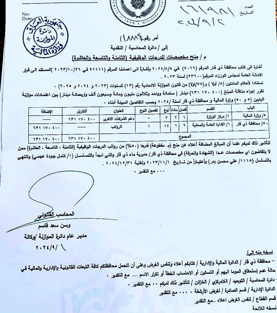 أعلنت مديرية ماء ذي قار عن استحصال موافقة وزارة المالية على تمويل مخصصات الـ 50% للدرجات الدنيا بأثر رجعي.