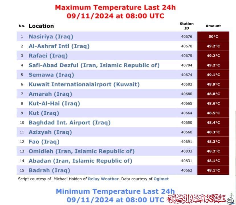لليوم الثاني على التوالي، تصدرت مدينة الناصرية قائمة أعلى درجات الحرارة المسجلة عالميًا خلال الـ 24 ساعة الماضية، حيث بلغت 50 درجة مئوية، وفقا لمؤشر محطة بلاسيرفيلي الأمريكية.