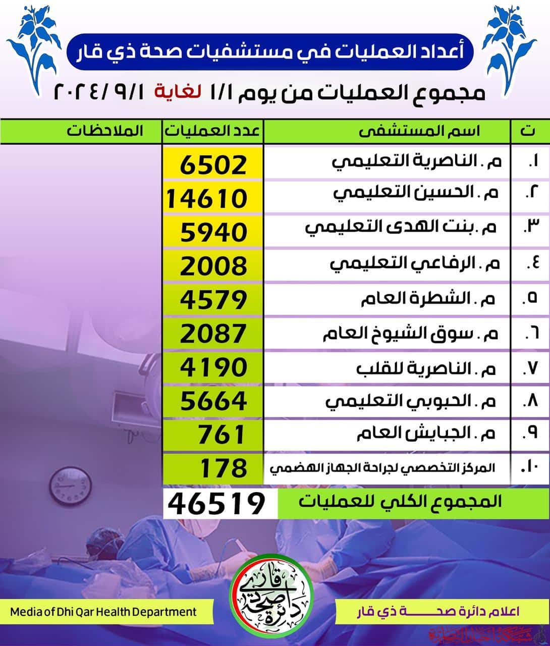 وأوضح مدير عام دائرة الصحة، الدكتور راشد نجم الخالدي، أن العمليات الجراحية شملت مستشفيات المركز والأقضية، حيث تم إجراء 14,610 عملية في مستشفى الحسين التعليمي و5,940 عملية في مستشفى بنت الهدى التعليمي للنسائية والأطفال، بينما سجل مستشفى الناصرية التعليمي 6,502 عملية جراحية.