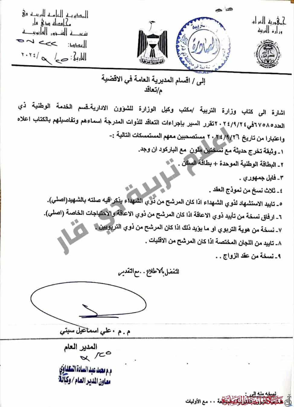 أعلنت المديرية العامة للتربية في محافظة ذي قار، بتوجيه من وزارة التربية، عن بدء إجراءات التعاقد مع المرشحين للعمل في قطاع التربية بالمحافظة.