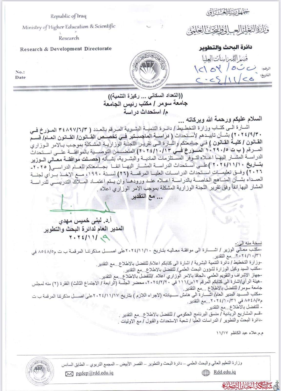 أعلن رئيس جامعة سومر، الدكتور عادل الزركاني، عن حصول الجامعة على موافقة وزير التعليم العالي والبحث العلمي لاستحداث برنامج الدراسات العليا (ماجستير) في قسم القانون العام، وذلك ابتداءً من العام الدراسي 2025-2026.