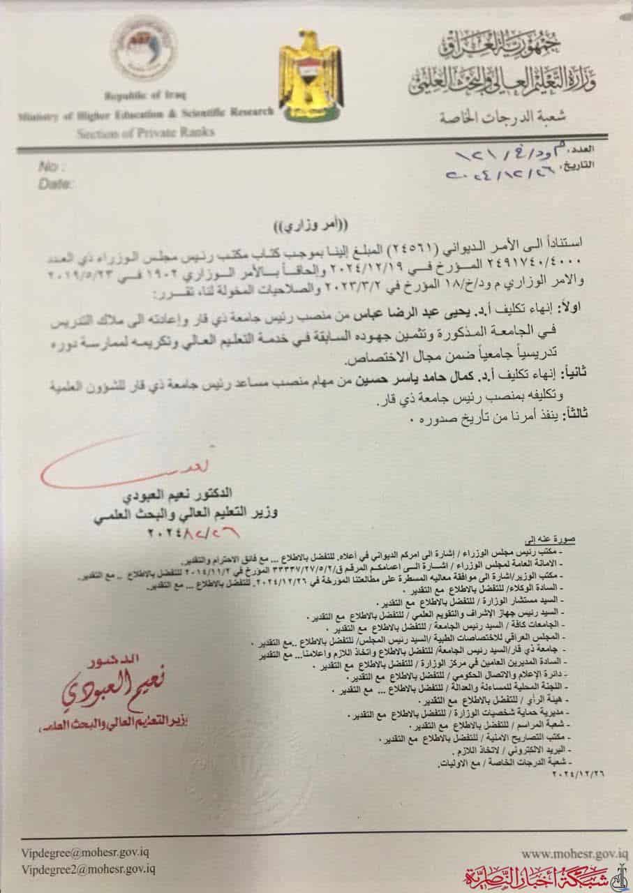 أصدرت وزارة التعليم العالي والبحث العلمي قرارا يقضي بإنهاء تكليف رئيس جامعة ذي قار، الدكتور يحيى الخفاجي، وتكليف المساعد العلمي بإدارة رئاسة الجامعة.