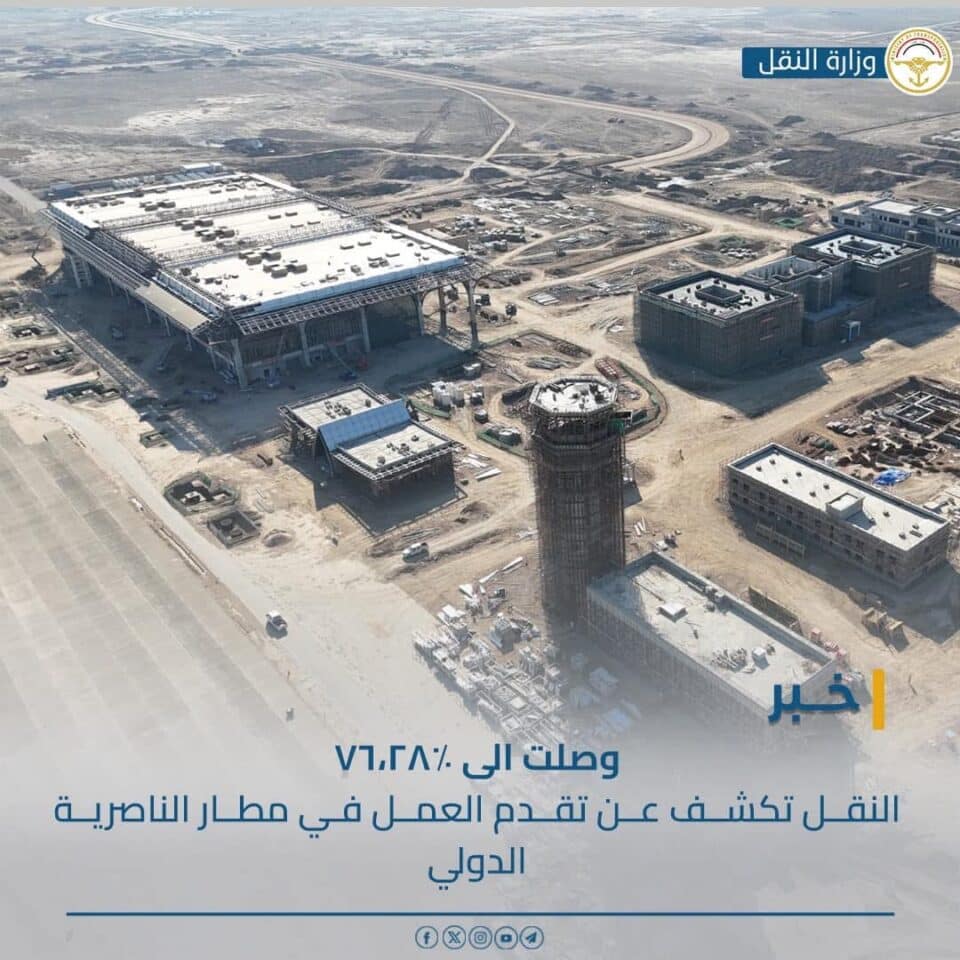 كشفت وزارة النقل اليوم الثلاثاء ، عن تصاعد نسب الإنجاز في مشروع مطار الناصرية الدولي بنسبة 76،28 % ، وذلك بعد تذليل العقبات أمام الشركة المنفذة .