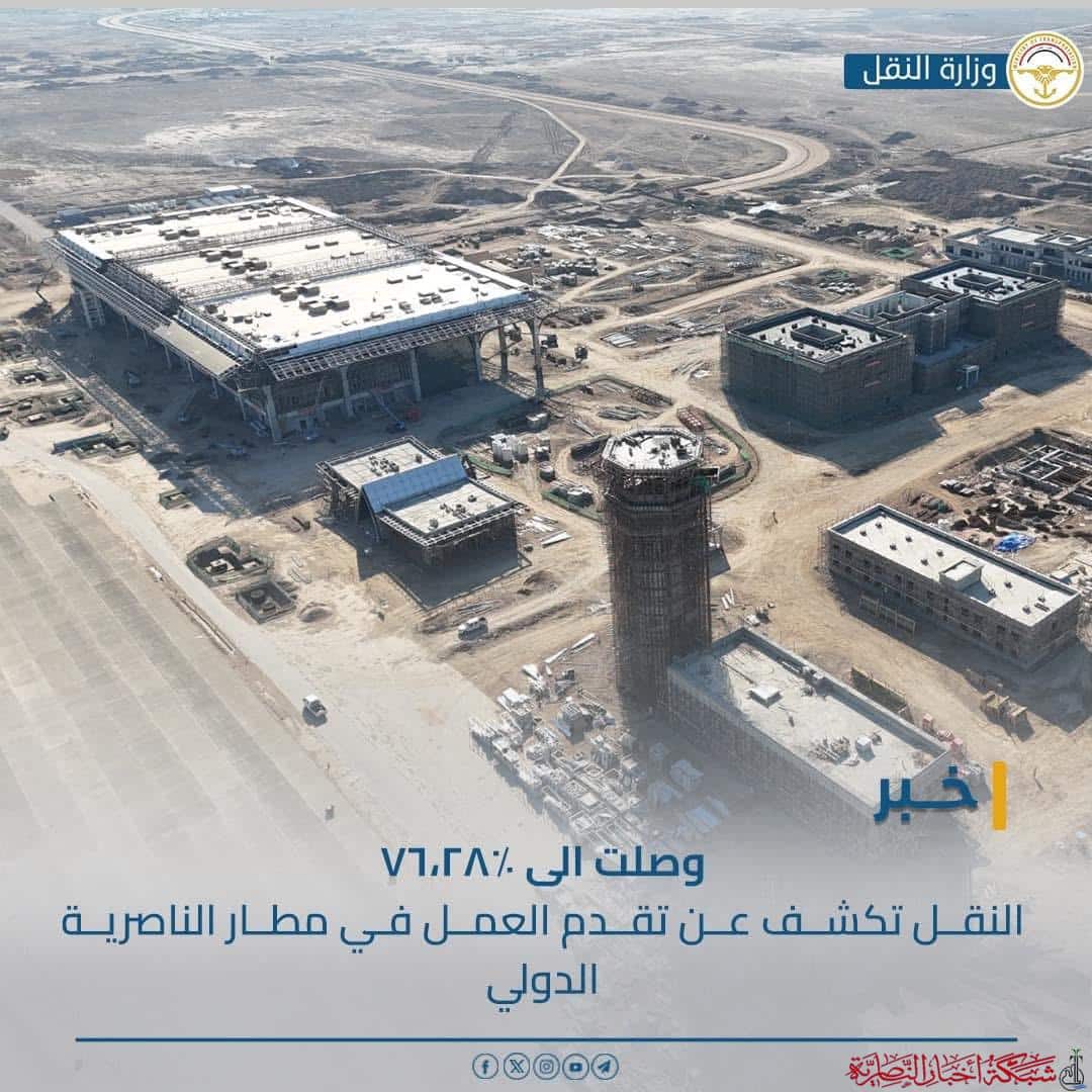 كشفت وزارة النقل اليوم الثلاثاء ، عن تصاعد نسب الإنجاز في مشروع مطار الناصرية الدولي بنسبة 76،28 % ، وذلك بعد تذليل العقبات أمام الشركة المنفذة .
