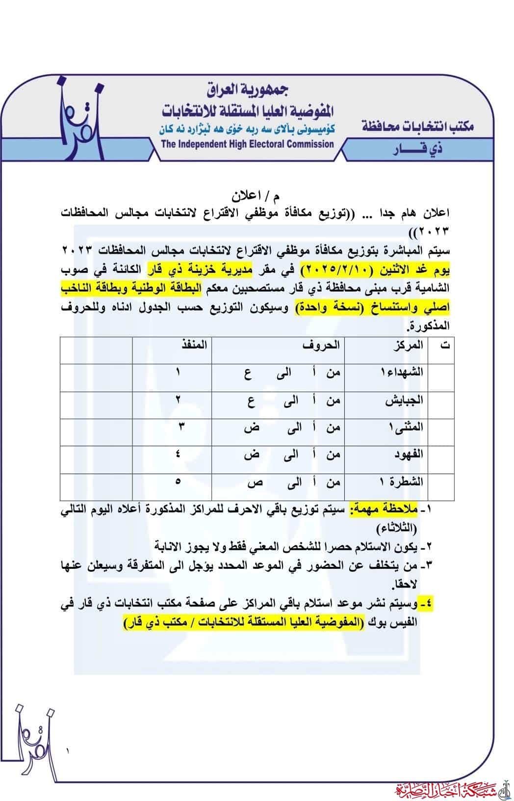 أعلن مكتب انتخابات ذي قار عن بدء توزيع مستحقات موظفي الاقتراع غداً الاثنين، حيث سيشمل التوزيع أكثر من 13 ألف موظف.