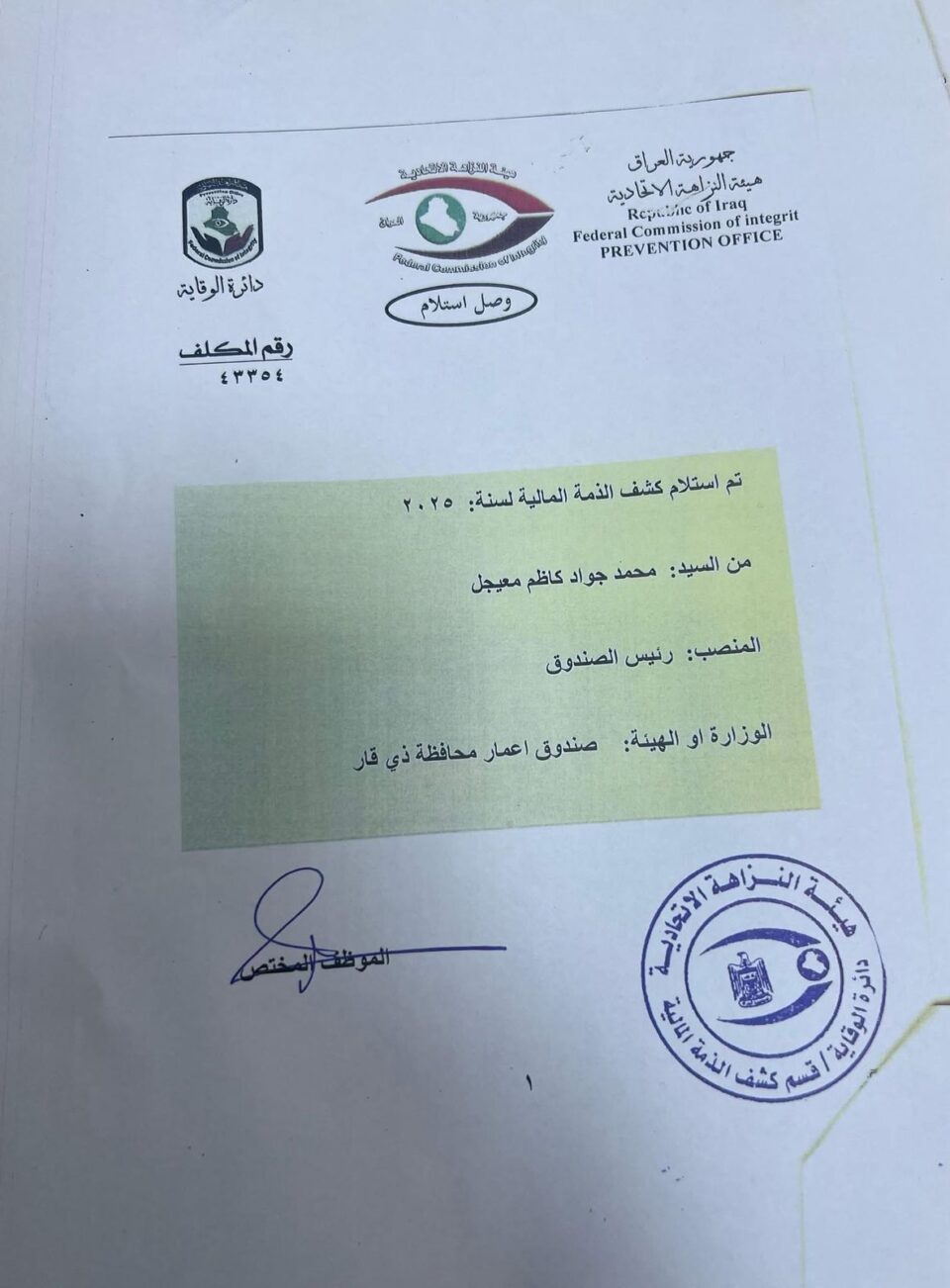 أعلن رئيس صندوق إعمار محافظة ذي قار، المهندس محمد جواد الزيدي، عن تقديم كشف ذمته المالية اليوم الثلاثاء، الموافق 11 شباط 2025، التزاماً بمبدأ الشفافية والمساءلة، وانسجاماً مع النهج القانوني الذي يفرض على المسؤولين التنفيذيين الإفصاح عن ممتلكاتهم.