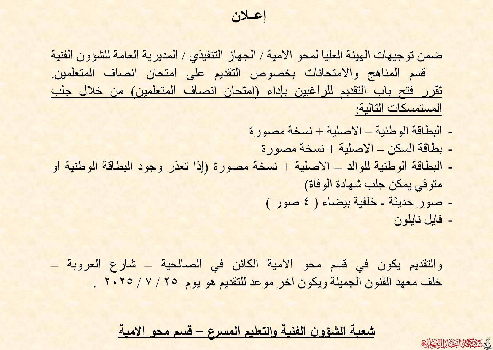 أعلن قسم محو الأمية في مديرية تربية ذي قار عن فتح باب التقديم للراغبين في خوض امتحان إنصاف المتعلمين وستكون مرتين في السنة الواحدة وليس شهريا ويتيح لغير الحاصلين على شهادة دراسية فرصة للحصول على الشهادة التي تؤهله خوض امتحان السادس الابتدائ والتقاعد والتعيين.