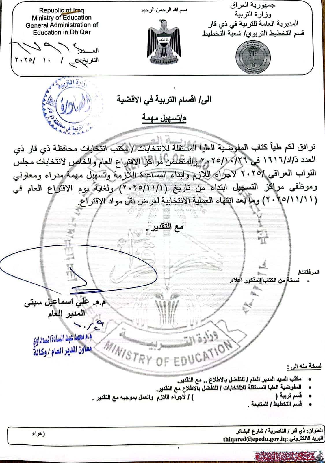 أعلنت المديرية العامة لتربية ذي قار، اليوم، عن إقرار قائمة المدارس التي ستُعتمد مراكز اقتراع في عموم محافظة ذي قار خلال انتخابات مجلس النواب العراقي 2025، وذلك ضمن خطة تنسيقية مشتركة مع المفوضية العليا المستقلة للانتخابات مكتب ذي قار.