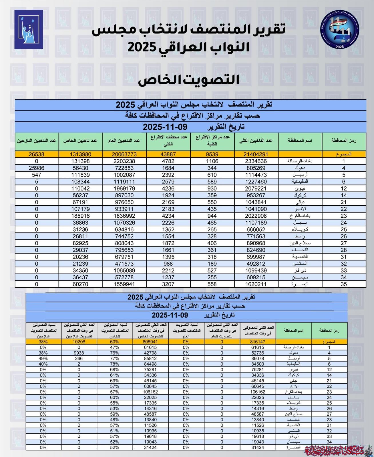 وأوضحت المفوضية أن عدد المصوّتين بلغ 19,618 ناخباً من أصل 21,239 ناخباً مسجلاً ضمن قوائم التصويت الخاص حتى وقت المنتصف.