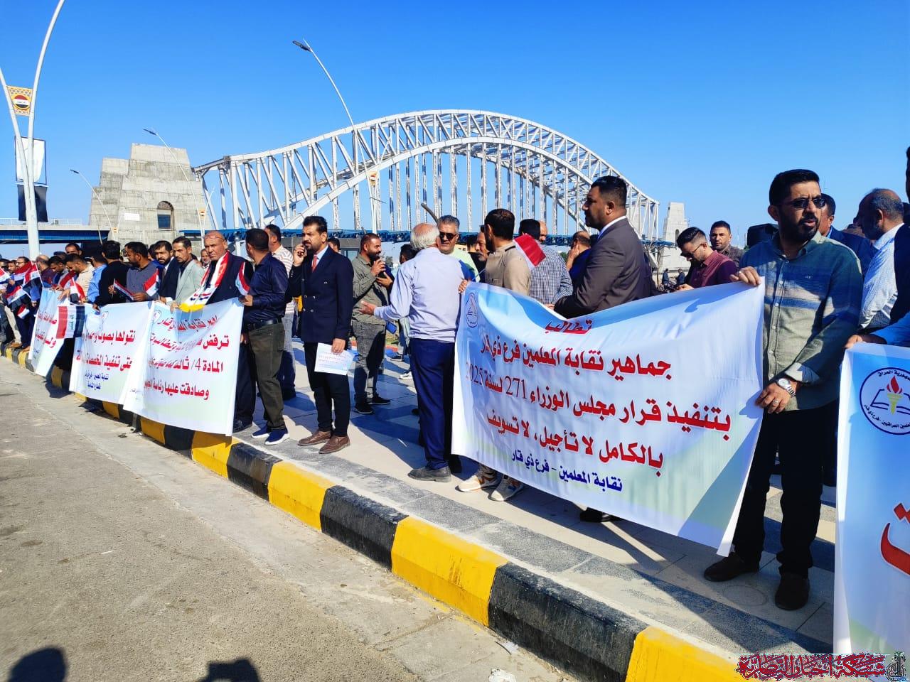 وأقيمت الوقفة في شارع الإمام علي وسط مدينة الناصرية، حيث رفع المحتجون شعارات تطالب الحكومة بالتراجع عن إجراءاتها والالتزام بالقوانين التي تكفل حقوق المعلمين.