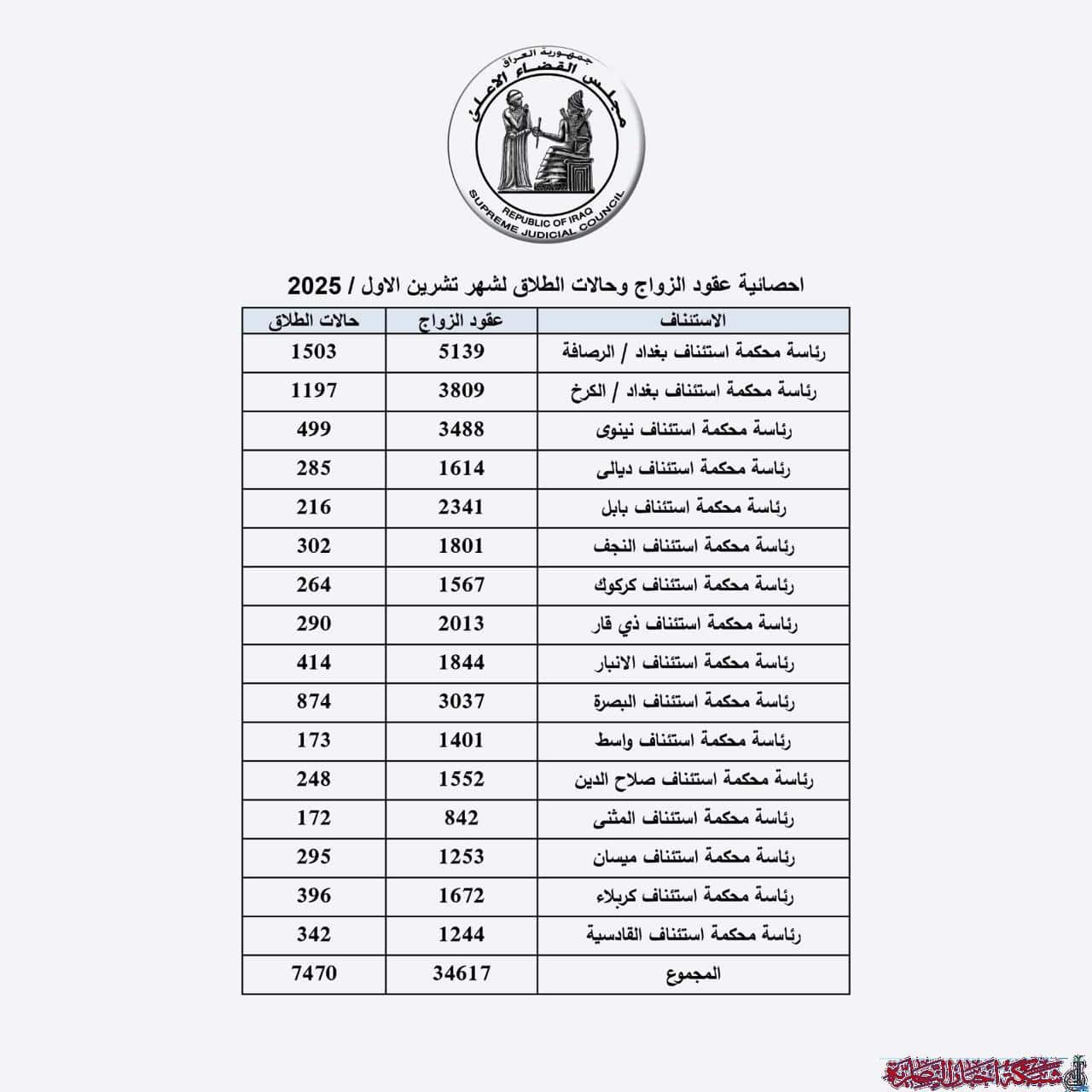 وبحسب الإحصائية، سجلت محاكم المحافظة 2013 عقد زواج خلال تشرين الأول، بزيادة كبيرة بلغت 1620 حالة مقارنة بشهر أيلول، في مؤشر على موجة إقبال استثنائية على الزواج خلال هذه الفترة.